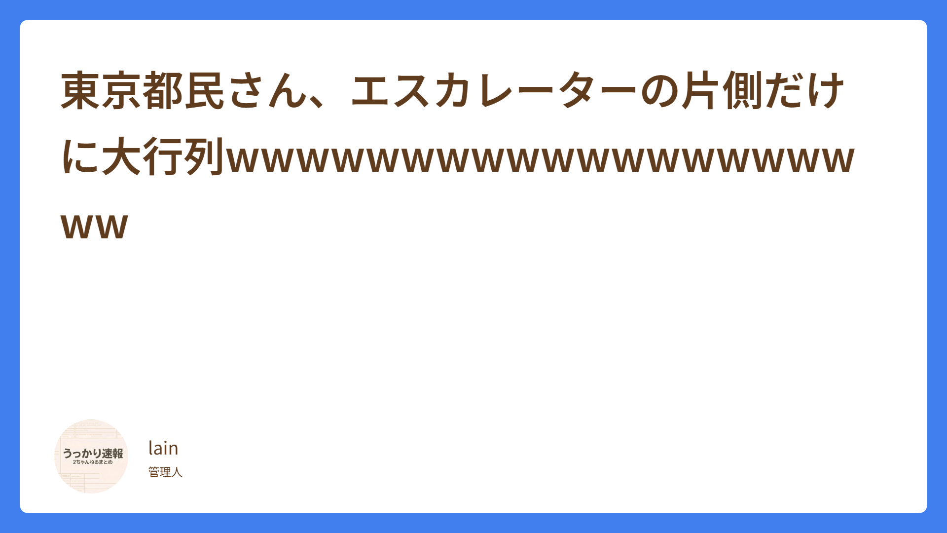 CATEGORY Uncategorized 【画像】女「何も無いのね」ハードボイルドワイ「…寝るだけの部屋さ」 2026.03.15 Uncategorized うっかり速報 うっかり速報 【急募】職場の飲み会を「すんなりと断る方法」の最適解wwwwwwwwwwwwww 2026.03.05 Uncategorized うっかり速報 うっかり速報 【悲報】「親の金で免許取ってそうw」←最凶すぎて禁止カードになる 2026.03.05 Uncategorized うっかり速報 うっかり速報 【朗報】人生、結婚子どもマイホームを諦めたらヌルゲーだったwwwwwwwww 2026.03.05 Uncategorized うっかり速報 うっかり速報 【朗報】日本、フロッピーが現役 自治体「FDに焼いて銀行に持参。昔から当たり前のやり方ですよ」 2026.02.28 Uncategorized うっかり速報 うっかり速報 クラスの女子全員敵に回した結果停学になりそうなんだが 2026.02.28 Uncategorized うっかり速報 うっかり速報 【悲報】セブンイレブン、狂う 2026.02.28 Uncategorized うっかり速報 うっかり速報 東京都民さん、エスカレーターの片側だけに大行列wwwwwwwwwwwwwwwwwwww 2026.02.26 Uncategorized うっかり速報 うっかり速報 彡(^)(^)「マックポーク復活!?190円くらいかな?(ほんまは150円くらいやろw)」→衝撃の結果にwww 2026.02.26 Uncategorized うっかり速報 うっかり速報 【悲報】一人暮らし始めたニートやけど「洗濯機、冷蔵庫」無しだけど余裕やな 2026.02.23 Uncategorized うっかり速報 うっかり速報 もっと見る
